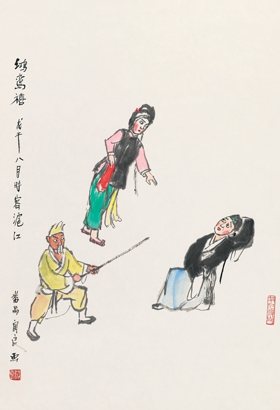 关良的画虽没有堂正之气和飘逸之姿,却得一“趣”字,戏曲人物与中国画的造型和笔墨观如约而至,得意忘形、不似之似,其趣得“戏”之精髓。此图《鸿鸾禧》就为我们充分阐述了他的艺术特点。画作完成于1978年,为关良风格成熟期作品,尺寸:67×46㎝;款识:鸿鸾禧,戊午八月时客沪江,番禺关良画;钤印:关良。作品描述的是源于冯梦龙编《古今小说》中《金玉奴棒打薄情郎》一节。画中人物在关良的笔下一一被赋予了鲜明的个性和活力。金玉奴两颊晕红,右手叉腰,左手戟指薄情郎,做愤怒娇憨状,似乎既有对薄情郎的怨恨,又有一种在父亲面前难言的深情,真是一往情深却又恨铁不成钢。而玉奴父亲则手持棍棒,脚踩弓步,怒目圆睁,形象夸张生动。再观薄情郎,半跪于地,右手置于身前,左手护头,似是惧怕老丈人的棍棒。面部表情相对画中另外两人更趋丰富,两颊羞红,眼神乞怜地望着玉奴,期盼得到她的原谅为他求情,令人捧腹。整幅画构图奇诡,运用西方绘画的独特空间感,令观者为之赞叹。